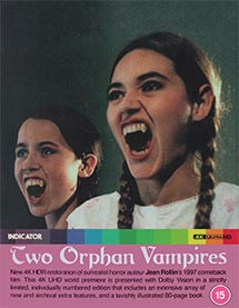 | Extras | Audio Commentary with David Flint and Adrian J. Smith (2023) Documentary: Memories of a Blue World - The Making of Two Orphan Vampires (2012, 42 min) Featurette: Infinite Dreams - Jean Rollin on Cinema, Surrealism and Two Orphan Vampires (2023, using 2002 interviews) Featurette: Bonded by Blood - Alexandra Pic on Two Orphan Vampires (2023, using 2002 interviews) Featurette: Eyesight to the Blind - Isabelle Teboul on Two Orphan Vampires (2023, using 2002) Featurette: The Smoking Vampires (2002) Featurette: Livres de Sang - tour of Jean Rollin's apartment (2002) Theatrical Trailer Image Galleries: Production and Publicity & New York Location Photography Plus: 80-page Book with a new essay by Patricia MacCormack, an archival introduction by Jean Rollin, an archival production report by Peter Blumenstock, an archival interview with Brigitte Lahaie, an extract from Rollin's source novel and full film credits |